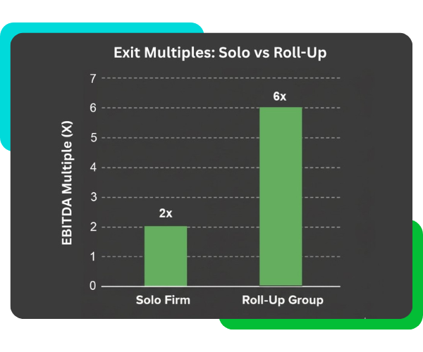 - Higher Multiples – Small firms sell for 2X–3X EBITDA, while roll-ups exit at 6X–10X